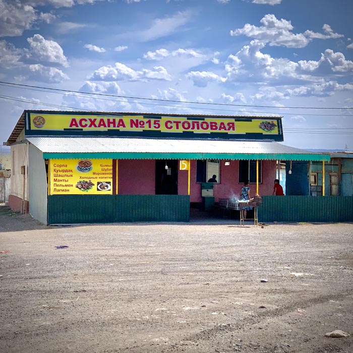Doksan beşinci kilometrede Akyrtobe’ye varıyorum. Artık güneş tam tepede ama rüzgar arkamda olduğu için pek sorun yaratmıyor. Karnım da acıktığı için durmaya karar veriyorum. Yolun kenarında bir ağacın altında küçük bir konteyner ve önünde tüten bir mangal görünce kenara çekiyorum.